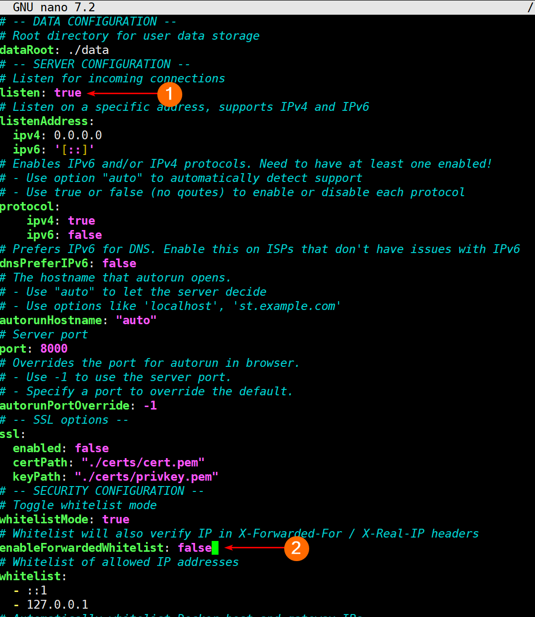 nano ~/SillyTavern/config.yaml(如果你在前面 不是把酒馆安装在用户目录下, 那么你自己找到配置文件的位置)